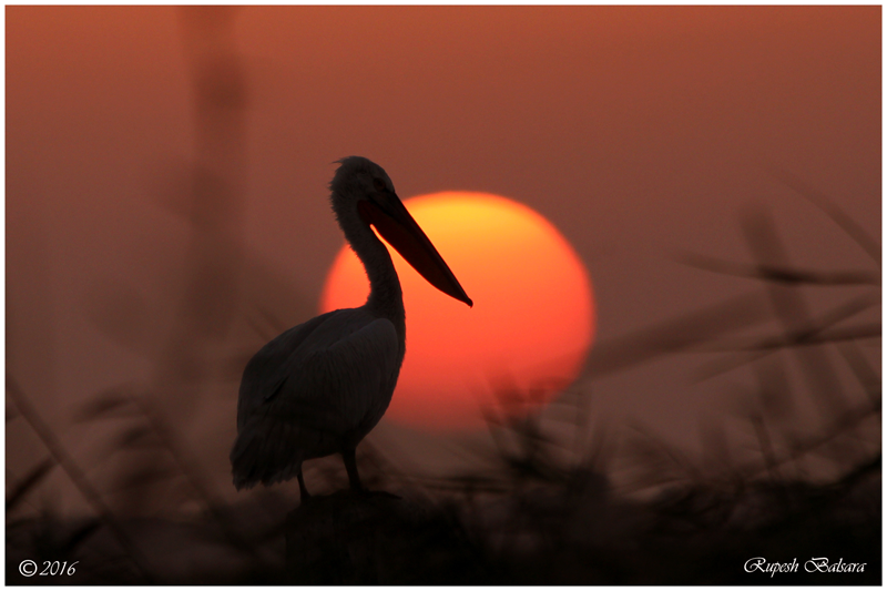 | Nal Sarovar Bird Sanctuary, located in Nal Sarovar, Gujarat consists of a lake mainly inhabited by migratory birds in winter and spring. At the largest wetland bird sanctuary in Gujarat, through his camera lens, photographer Rupesh Balsara captures a picture of a Dalmatian Pelican at sundown at Nal Sarovar. |