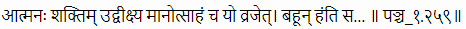 Translation: One who proceeds to war after evaluating his own strengths/ will-power properly, his level of determination to see the battle through to the very end, and understands that his self-respect and reputation is at stake – he can kill many enemies.