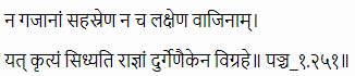 Translation: A good fort can protect a Raja/ kingdom from enemies better than soldiers on a thousand elephants or a lakh of horses.