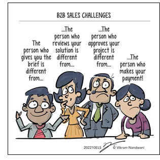 - Multiple internal and external stakeholders: In B2B markets, there is no single decision maker, but a group of people at the end user, machinery manufacture, contractor or even consultants for bigger projects. Also at all places, there are buying committees comprising of purchase, technical expert, finance, operations, services, etc. Attracting, reaching, engaging & influencing multiple stakeholders at each stage of the buying process, and getting a buy-in from them is an enormous task for salespeople.