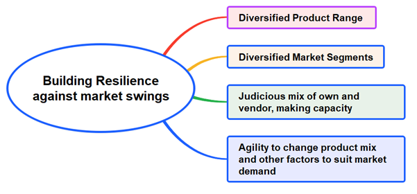 It is imperative for MSME organizations to get prepared for varying business seasons. Downturn is a routine part of business cycles which keep changing the demand levels over time. The best way to get prepared for such changes is to ensure diversified stability. The above figure shows the ways to introduce broad basing in the different segments of the business and become resilient. All products and market segments do not follow same (synchronized) upturns and downturns. This makes the business follow an almost uniform demand path over time. One most important requirement of the leader is to be outward looking and keep a keen eye on the movements in the market and be agile and be prepared to meet the changed situation, in advance.